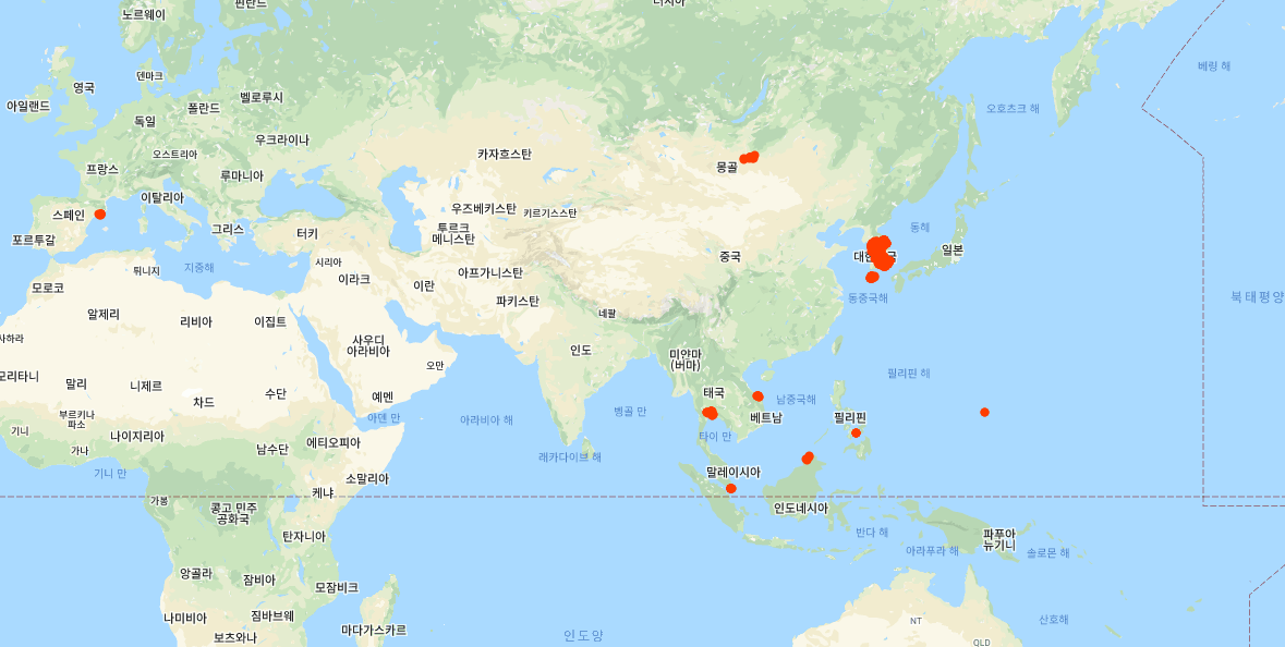 전체로 놓고 보니, 타임 라인에 등록이 2013년도 부터 되도록 했으니, 8년여 동안 다닌곳이 보여진다.